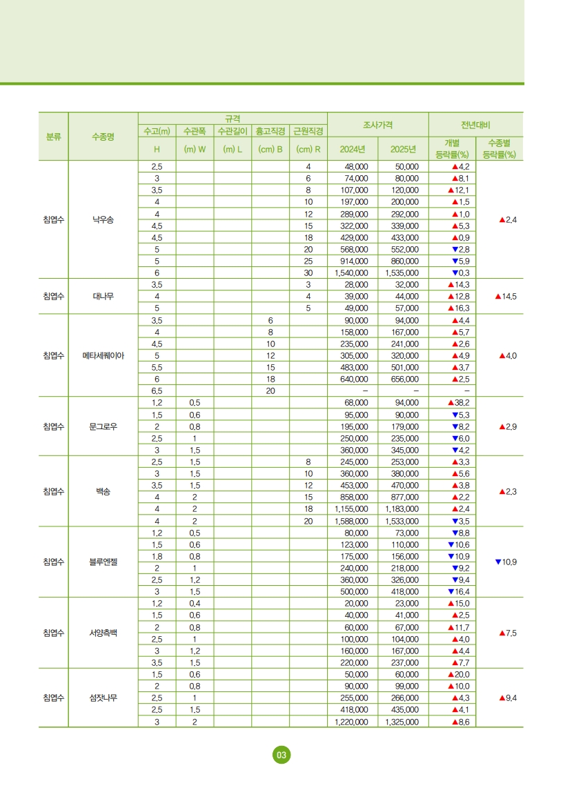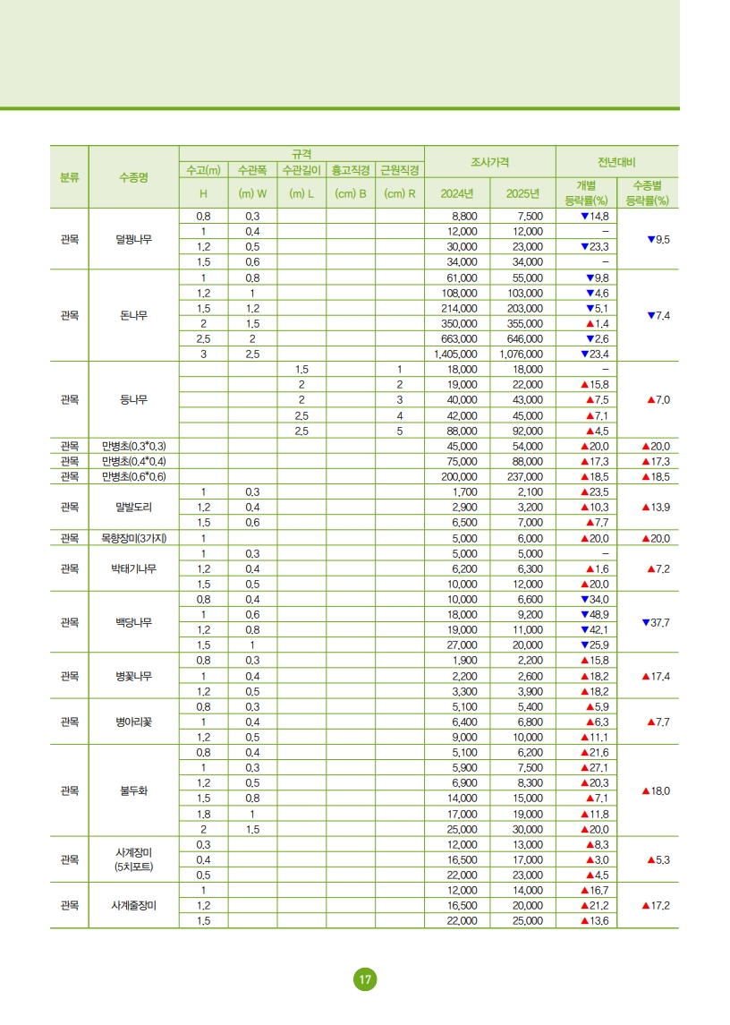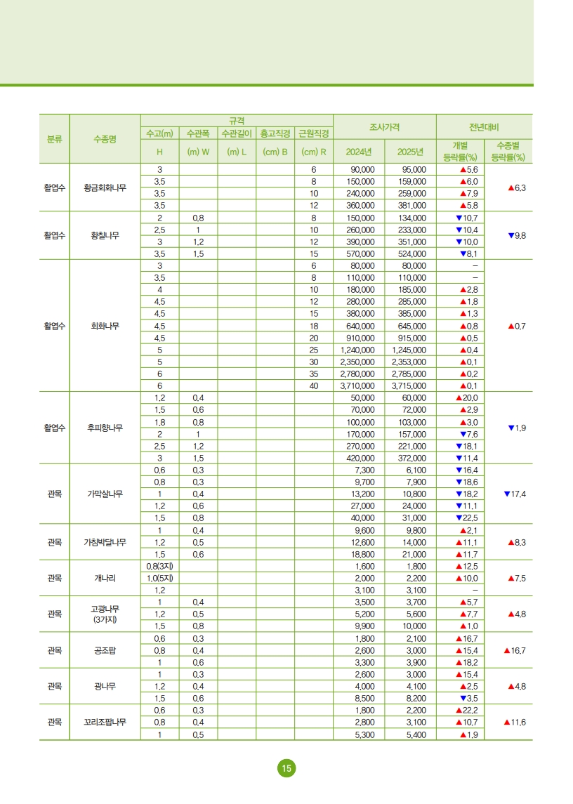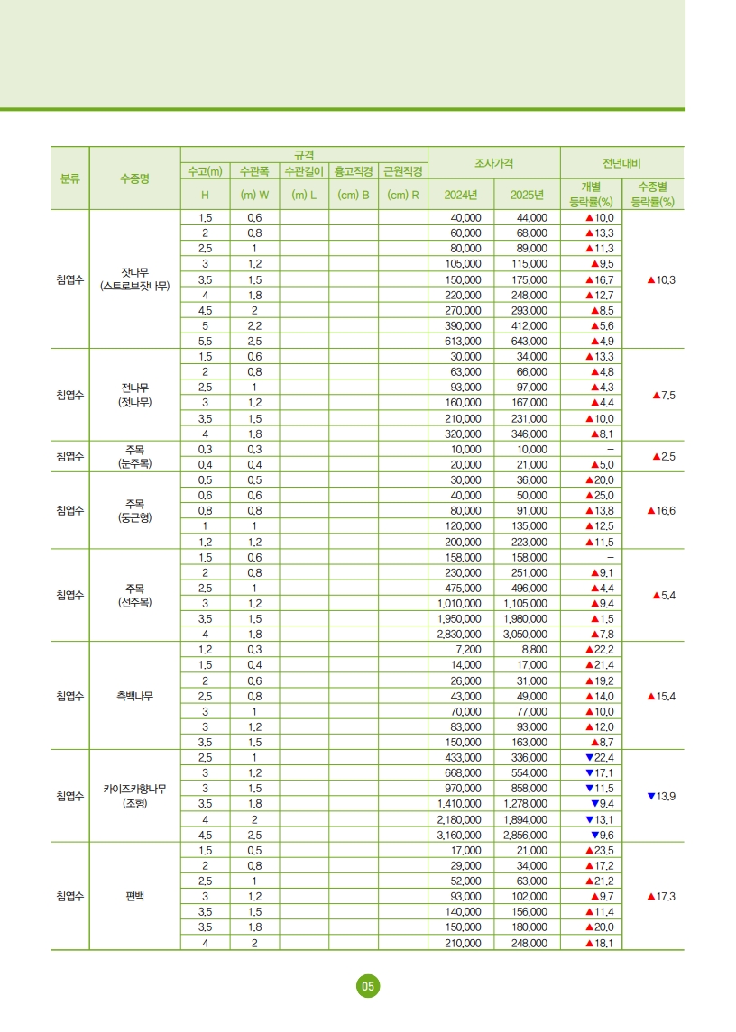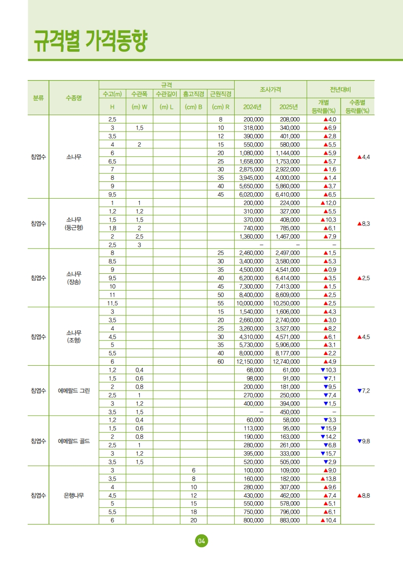 한국농촌경제연구원에서 2025년 12월 4일자로 임업관측(조경수)에 대한 가격이 발표되어 알려드립니다. 업무에 참고하시기 바랍니다.