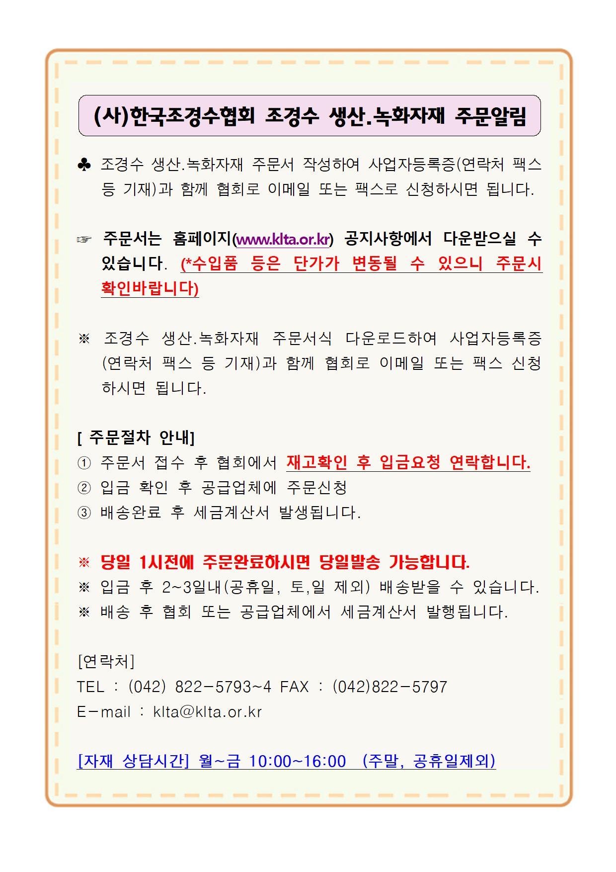 ※ 조경수 생산.녹화자재 주문서식 다운로드하여 사업자등록증(연락처 팩스 등 기재)과 함께 협회로 이메일 또는 팩스로 신청하시면 됩니다. [ 주문절차 안내]