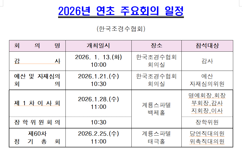 [2026년 연초 협회 주요회의 일정] 안내하오니 업무에 참고하여 주시기 바랍니다. |